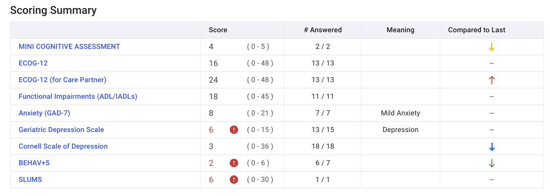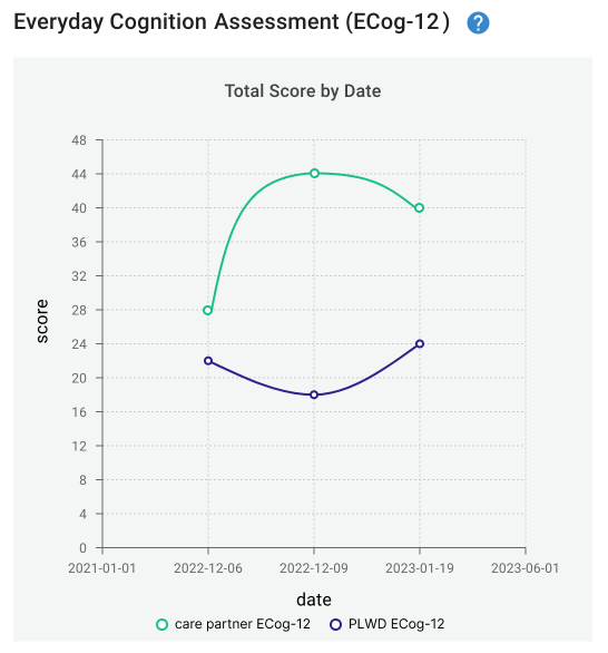 In some instances, the same assessment is administered to both the care partner and the PLWD. When working with PLWD they can have trouble accurately answering questions about their health and well-being over time. It would be useful for interpreting scores to be able to see both assessment scores on the same graph to see how the PLWD interpretation of their own health differs from an outside perspective. Below the mock-up shows how layering the two assessment graphs makes it easier to interpret the difference in scores.