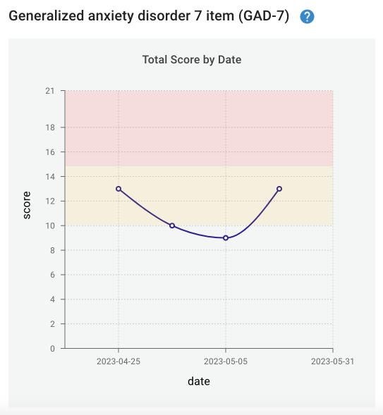 Many of the interviewees liked the indications on if a score change was “good” or “bad” in the scoring summary but expressed that it would be more difficult to quickly determine the trend in the graphs of the scores over time. We recommend adding shading to the trend graphs to indicate the ranges of concerning scores. Below are two examples that illustrate how adding shading would make the trend of the assessment graphs easier to interpret.