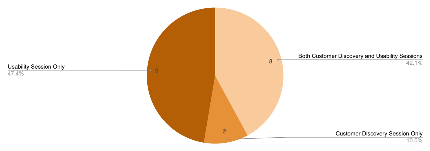 We interviewed a total of nineteen participants in thirteen sessions. Eight participated in both the customer discovery and the usability sessions, two participated in only the customer discovery interviews and nine of the participants only participated in a usability session.